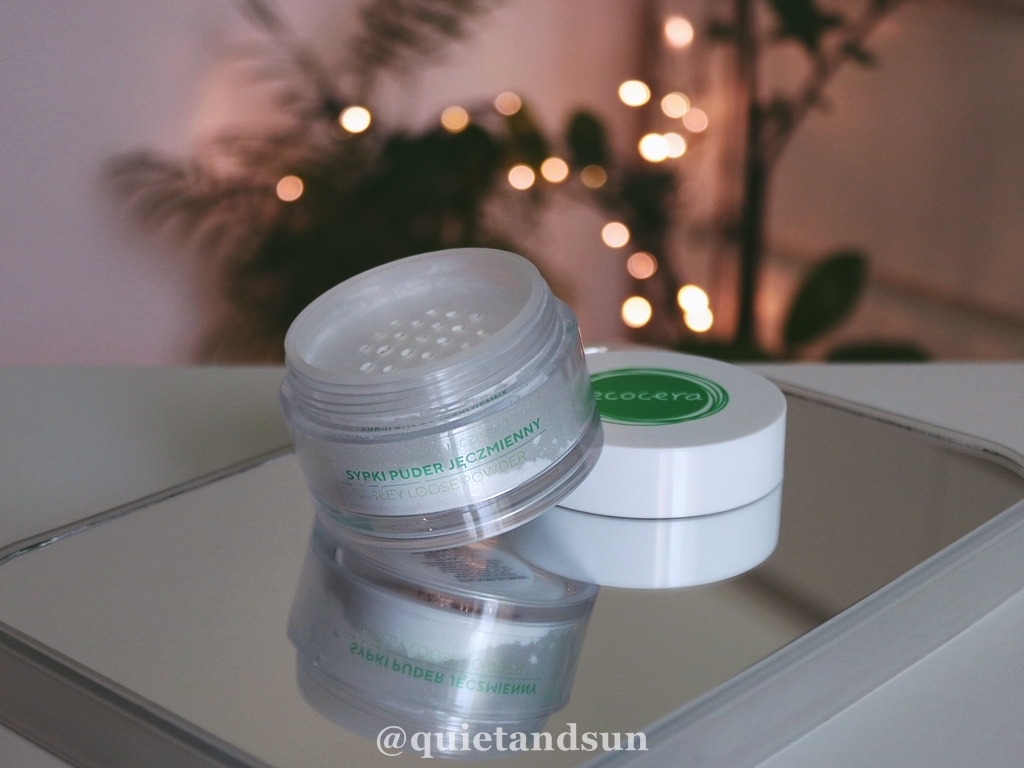 Z Ecocery miałam kiedyś próbkę pudru ryżowego. Sprawdził się on u mnie średnio, nie mniej jednak marka nadal mnie interesowała. Dlatego zdecydowałam się zaryzykować i w Hebe, totalnie w ciemno, kupiłam puder jęczmienny. Przede wszystkim zachęcił mnie fakt, iż jest to kosmetyk wegański. Aktualnie kosmetyku została mi już resztka na dnie, więc myślę, że mogę się na jego temat wypowiedzieć.