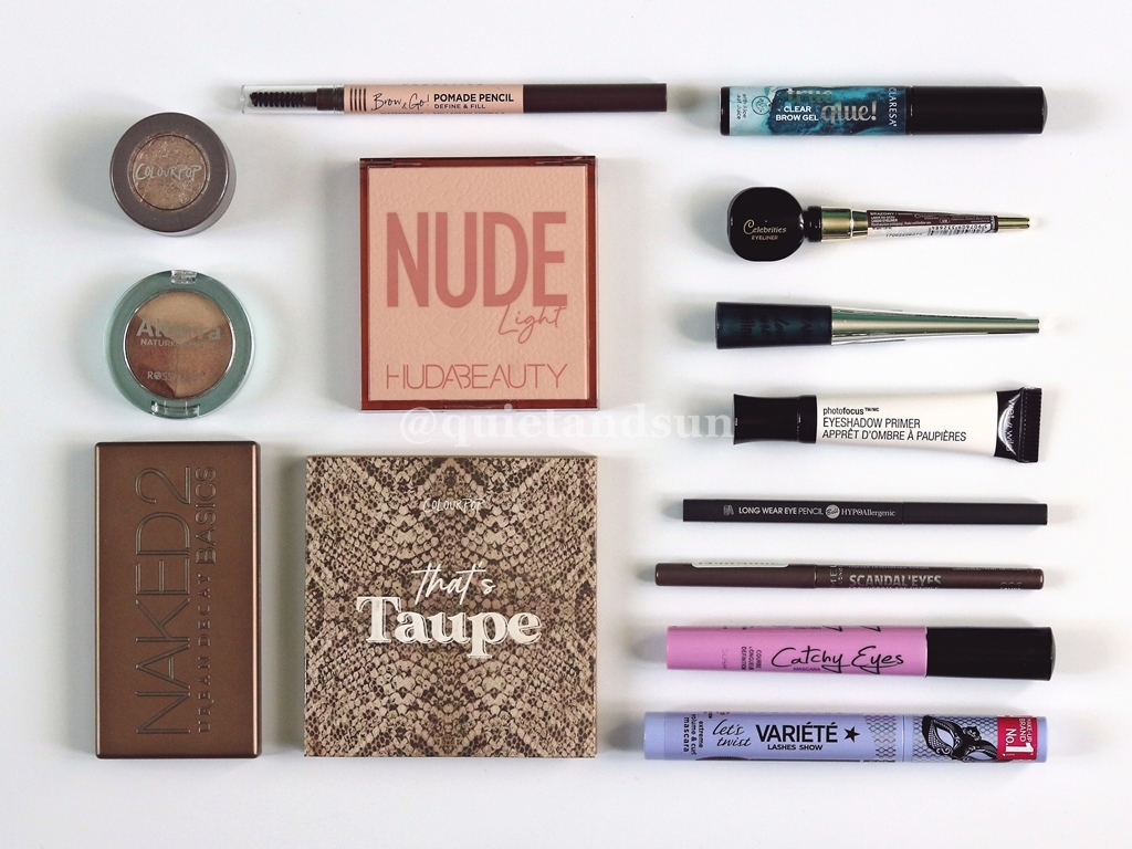 Dalej są moje trzy palety cieni do powiek. Urban Decay Naked Basics 2 to klasyka, po którą sięgam bardzo często. Nie do końca odpowiadają mi wszystkie kolory, ale sama jakość cieni jest na bardzo wysokim poziomie. Ponadto paletka ma lusterko, jest lekka, poręczna i można ją zabrać wszędzie. Colour Pop That's Taupe - to mój absolutny ulubieniec. Paletka ma świetnie dobrane kolory, które idealnie mi pasują. Jej jakość oceniłabym na dobry. Niektóre cienie się osypują, ale pigment mają w porządku, dobrze się blendują i ładnie wyglądają przez cały dzień. Szkoda, że trzeba ją ściągać ze stanów. Ostatnia paleta Huda Beauty Nude Light trochę mnie rozczarowała. Cienie są śliczne, ale maty bardzo mocno sprasowane i mają słaby pigment. Trzeba je naprawdę sporo razy dokładać na powiekę, aby zbudować kolor. Błyski natomiast troszkę się sypią i chyba mnie lekko uczulają. Za każdym razem gdy ich używam, po kilku godzinach zaczynają mnie swędzieć oczy. No nie trafiłam z tą paletką.